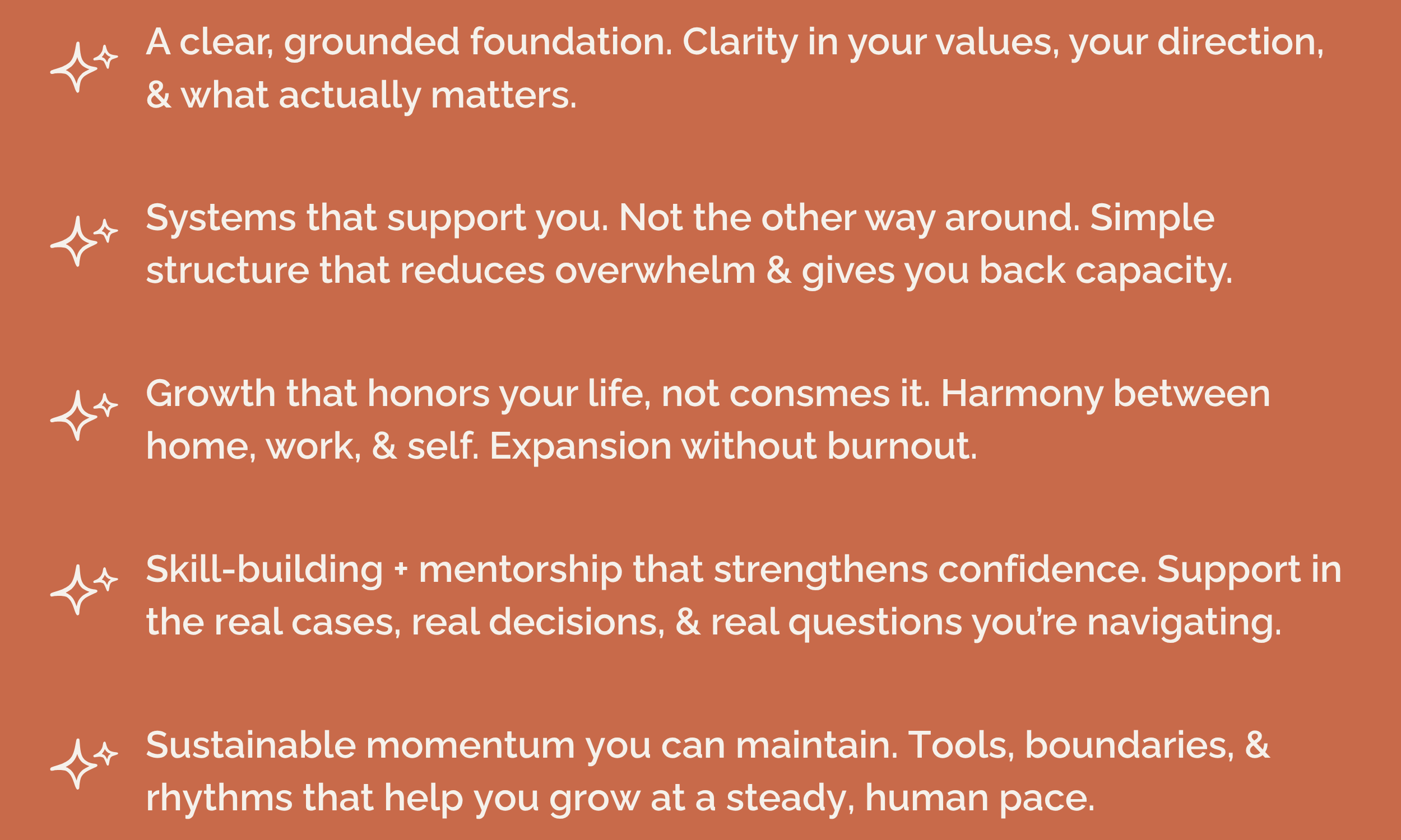 Outcome: A practice, business, & life that thrives, grounded in purpose, sustained by balance.